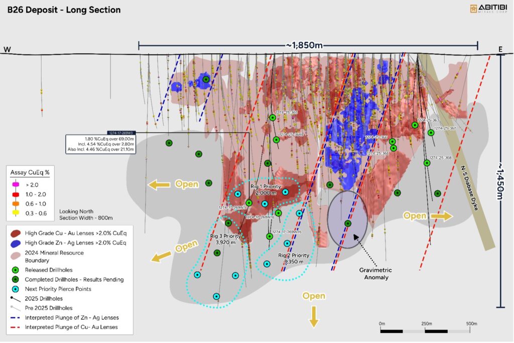 October 9, 2025 – London, Ontario – Abitibi Metals Corp. (CSE: AMQ | OTCQB: AMQFF | FSE: FW0) (“Abitibi” or the “Company”) is pleased to announce the expansion of its Phase 3 drill program at the B26 polymetallic deposit in Québec to 20,000 metres, alongside the release of final assay results from hole 1274-17-269W3. Drilling continues to successfully intersect mineralization outside of the current Mineral Resource Estimate (“MRE”), confirming the potential to expand the mineralized footprint.